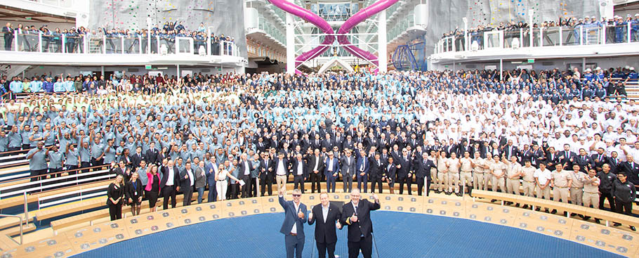 Al acto asistieron: Jason Liberty, presidente y director ejecutivo de Royal Caribbean Group; Michael Bayley, presidente y director ejecutivo de Royal Caribbean International; y Laurent Castaing, director general de Chantiers de l’Atlantique. Además de 1.600 miembros de la tripulación y trabajadores del barco en el AquaTheater del barco para la primera fiesta a bordo.
