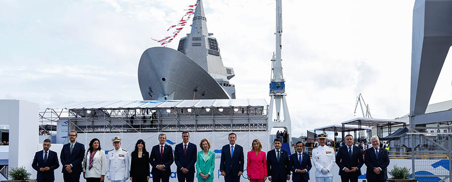 El acto contó con la participación del presidente del Gobierno, Pedro Sánchez y con Su Majestad la Reina Sofía quien, como madrina del buque, con el tradicional lanzamiento de una botella contra el casco un momento antes de que la fragata se deslizase por la grada hasta la ría.